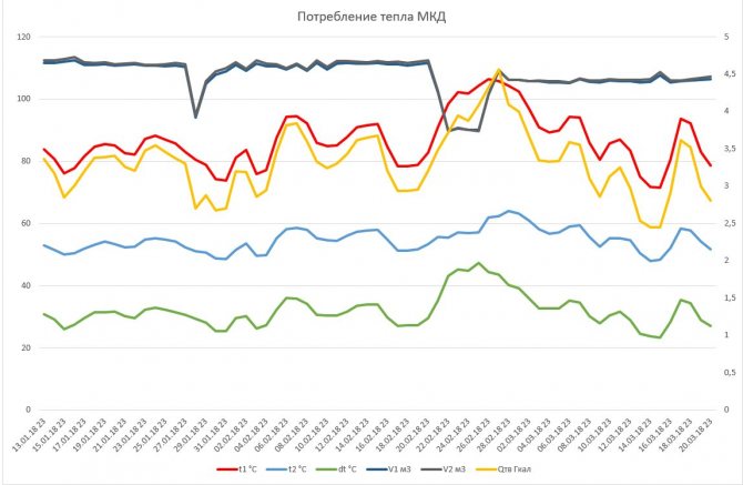 Nachdem wir die Daten in Excel haben, können wir Diagramme zeichnen und einige Schlussfolgerungen ziehen. Oh, wie viel können Sie auf den Charts sehen! In der ersten Grafik gibt es beispielsweise zwei Absenkungen des Kühlmittelvolumens (obere dunkelblaue und graue Linien), die durch das Haus fließen. Dies ist höchstwahrscheinlich ein Rohrversagen in dem Bereich. Fällt nur mit einer Erhöhung der Vorlauftemperatur zusammen (Frost!)