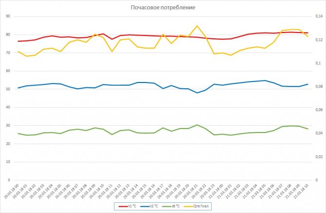Die rechte Achse ist Q, die die Wärme in Gigakalorien pro Tag anzeigt. Wie gesagt bei der Rate von 1 Gigacaloria in Vladimir kostet 1987.40 Rubel. In der Grafik sind Gigacalories mit einer gelben Linie markiert. Dies ist die Anzahl der Gigakalorien, die das Haus in einem Monat ansammeln wird. Dieser Betrag wird mit 1987,40 Rubel multipliziert, dann in Wohnungen aufgeteilt und Sie bezahlen ihn in Ihren Quittungen für eine Gemeinschaftswohnung. Die roten und blauen Linien geben die Durchfluss- und Rücklauftemperaturen an. Werte auf der linken Skala. Die grüne Linie ist das Delta, d.h. diese Temperatur, wie viel Ihr Haus zum Heizen brauchte. Wie Sie sehen können, liegt die Serviertemperatur bei kaltem Wetter über 100 Grad. Und wenn es durchbricht, ist es lebensbedrohlich!