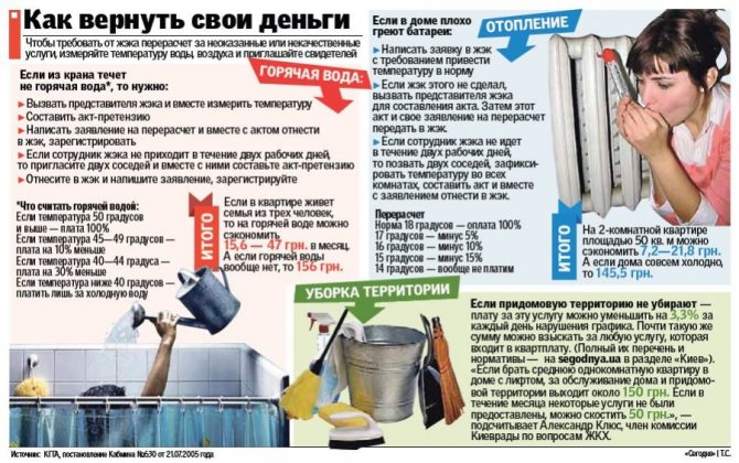 Wenn die Dauer der Reparaturmaßnahmen die gemäß den Normen zugewiesene Zeit überschreitet, ist der Wärmeversorger verpflichtet, die Zahlung neu zu berechnen. Der Wert verringert sich für jede zusätzliche Stunde unterbrochener Wärmeversorgung um 0,15%. Gemäß den Regeln muss dieselbe Neuberechnung für die gesamte Zeit durchgeführt werden, in der die Temperatur in den Wohnungen unter der zulässigen Temperatur (18 ° C) lag. In diesem Fall kann der abgezogene Zahlungsbetrag nicht höher sein als der Betrag für den gesamten Zeitraum, in dem den Heizkörpern nicht genügend Wärme zum Heizen zugeführt wurde. In einigen Fällen erlaubt die Verordnung die vollständige Befreiung der betroffenen Einwohner von der Zahlung.