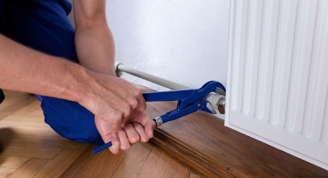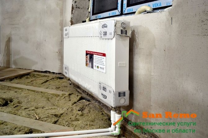 - Wenn der Kühler zusammengebaut ist, wird er an die Halterungen gehängt und mit Rakeln an die Heizungsrohre angeschlossen. Vor dem Anschließen müssen Sie den Installationsgrad des Kühlers überprüfen.
