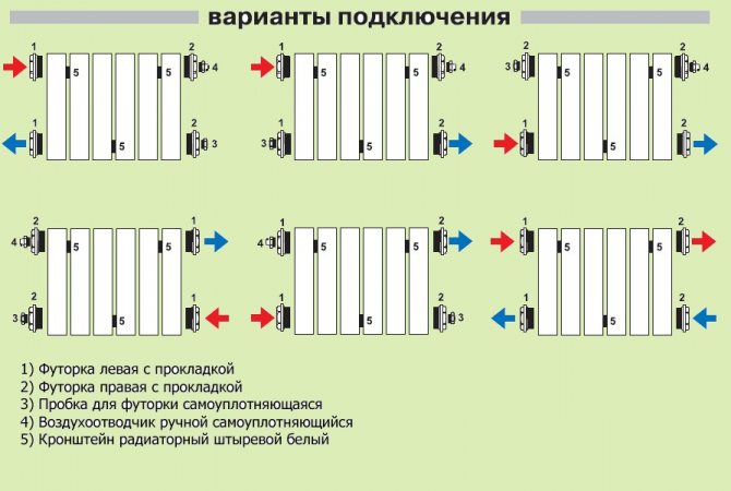 Ich möchte Sie daran erinnern, dass die Installation eines Stahlkühlers auf drei Arten möglich ist: Rohrleitungen von unten, von oben, von beiden Seiten. Es gibt mehrere weitere Verbindungsoptionen.