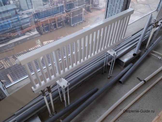 - Die nächste Stufe ist Hängen Sie die Struktur an die oberen Klammern und erst dann wird es auf der Bodenhalterung für Stahlheizkörper installiert.