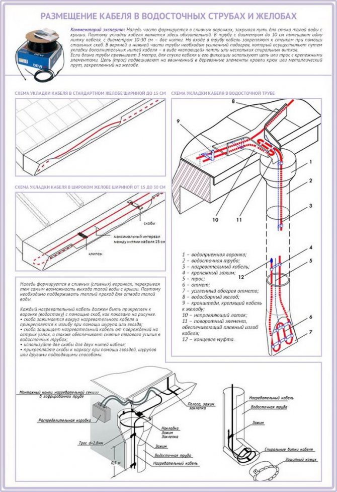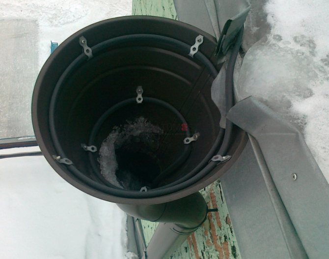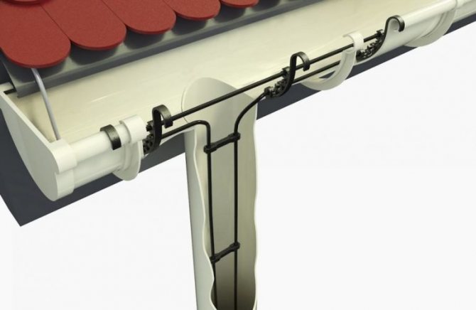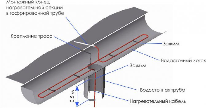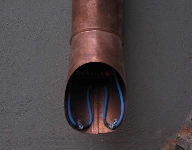 Bei Fallrohren wird das Heizkabel auf die gleiche Weise installiert: Entweder wird es einfach nach innen gewickelt oder von außen mit Klebeband befestigt. Wärmeschrumpfbare Rohre können als Befestigungselemente verwendet werden. Wenn das Rohr eine Länge von mehr als 6 m hat, muss das Kabel an einem Metallkabel mit einem Polymermantel befestigt werden, um einen Bruch aufgrund seines eigenen Gewichts zu vermeiden.