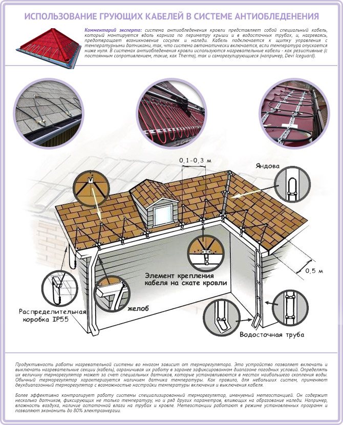 Heizsysteme dieser Art funktionieren nicht ständig, sondern nur beim Auftauen, dh im Herbst-Winter sowie im Winter-Frühling, wenn die Außentemperatur zwischen -5 und + 3 ° C liegt. Diese Zeit ist nur die günstigste für die Eisbildung und das Auftreten von Eiszapfen.
