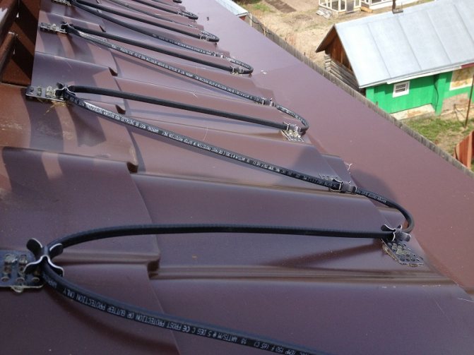 Auf dem Dach wird das Kabel mit Lochband befestigt, das mit selbstschneidenden Schrauben angeschraubt oder mit Spezialkleber (auf Weichdächern) verklebt werden kann. Beim Einbau einer selbstschneidenden Schraube werden er selbst und das Loch im Dach mit einem Dichtmittel behandelt. Überschüssiges Dichtmittel sollte nicht entfernt, sondern mit einem Hardware-Kopf beschichtet werden.