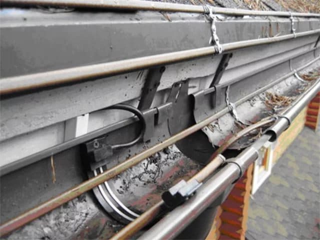 - In den Rinnen und Rohren wird das Heizkabel mit Klebeband in Streifen quer befestigt. Wenn das beheizte Abfluss- oder Abwasserrohr länger als 6 m ist, wird der Draht zuerst an einem Metallkabel in einem Mantel befestigt, und dann wird die gesamte Struktur in das Rohr abgesenkt.