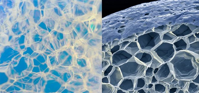 Das Makrofoto zeigt, dass der Schaum aus geschlossenen Zellen besteht, die mit Luft gefüllt sind.