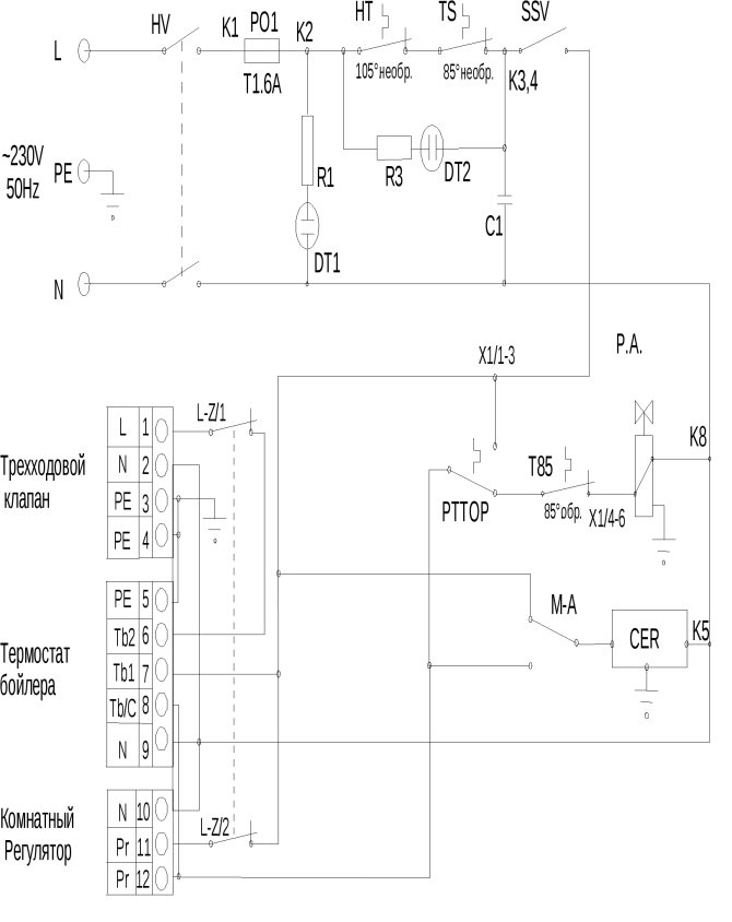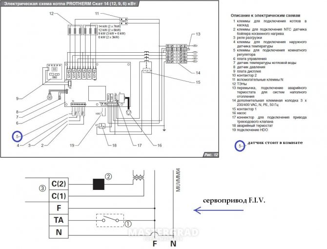 He was engaged in the installation of the Proterm Skat 9 kW boiler, a boiler room and a warm floor. Yesterday I refueled the system, gave a pressure of 1.7 bar. Preparing for power supply. The question arose: I measure the pressure with an external pressure gauge - I installed it on the return line. But which one is the pressure gauge in the boiler? He clearly needs to be prepared for work somehow. Apparently you need to bend it back? Otherwise, you will not look at it from below. Please specify how to bend it so as not to break everything or not touch it at all? You don't need to bend anything. Lower mechanical pressure gauge for visual control when the device is not connected to the mains. For operation, the electronic menu of the unit is enough for you. How to switch, read the instructions. Please tell me what is the reason for the requirement of the installation instructions for the electric boiler Proterm Skat 12 kW, which says that the distance to the ceiling from the top of the boiler is 700 mm? The heating elements are pulled up when replacing. Distances of 40-50 cm should be sufficient. Help to understand such a problem. I installed the Protherm Scat 18 kW boiler, through the native Fugas three-way valve and the temperature sensor I connected the Hajdu STA 300 C indirect heating boiler to it. Power, then to Pressure and further in a circle. I cannot set the hot water temperature accordingly. For what reason may the unit not see the boiler? The heating system was started up normally, adjusted, the air was expelled. Radiators heat well, no problem. The device is still operating at 6 kW, the coolant temperature is 55 degrees. The three-way valve is turned on in its position, the sensor is connected, but its wire is extended by 10 meters with a wire with a cross section of 0.7 squares. Maybe this is the problem or something else? The sensor was stuck in the wrong place. Check again. The installation of the heating system is coming to an end, and it will be necessary to start the electric boiler Proterm Skat 6 kW into operation. Tell me what to do with air vents, etc., how and what to unscrew, where to leave what to unscrew? And yet, a black plastic threaded fitting, about which it is written that you need to drain to the street or to the sewer - is it really necessary to do this? Switch on - switch off automatically? In the process of bleeding air, it will probably be necessary to recharge the system to a certain pressure? As I understand it, your system is also propylene, how many degrees maximum do you feed into propylene? Open the air vent on the pump permanently (a couple of turns of the cap). Drain the air from the heat exchanger with a tap through a transparent tube dropped from the bottle. Run the device for 10-20 seconds. Switch off. Bleed the air from the faucet again. Run for a couple of minutes. Stop. Lower again. If antifreeze without bubbles comes out of the tube, you can turn on the boiler permanently and go to expel air from the radiators through the Mayevsky tap. After a day, check that there are still no bubbles in the antifreeze from the tube. After 3-4 days, go through the radiators again, release the air. After a week, repeat again. Never close the air vent on the pump.It may erupt from the fitting when pumping. At least until the system reaches performance indicators - substitute something. Then it is not necessary. On off. automatic, yes. It may and will have to be fed. It depends on how many you initially pump. I have PP pipes, I don't recommend more than 75. But I set the weather so that it was 75 degrees, only starting from -5 outside, and at other temperatures - more benign values. Electric boiler Proterm Skat 14 kW. There is a scheme for the operation of this model on hot water supply through a three-way valve and an NTS sensor. For example, I have an electric boiler of 9-12 kW, I need only 6 kW for heating. I, of course, lower it from the settings panel to the required one. But when switching to DHW heating, how much will it consume? Are the power settings saved for both DHW and heating? Is it possible to supply, for example, also 6 kW for DHW heating? DHW output is not regulated (always full output). Your hot water supply does not always work. And at higher power, the device will heat up the water faster. What is more economical, it takes longer to warm up with a weak device or faster with a powerful one, you have to look. Malfunction of the electric boiler Proterm Skat 28 kW. Error F20 caught fire, climbed to look for a red button, the cap did not slide off it in any way, forged with a screwdriver and short-circuited the sensor terminal, which with the button, to the tenov case, a small spark, the device went out and does not turn on. What are the consequences? See fuses. There are 2.80 mA and 1.6 A. The house is 100 square meters, I plan to install and install an electric boiler Protherm Skat 9 kr-13, I plan to bring 3 phases of 3x5 kW to the house, if one of the phases is cut down (and this is what we have often), then the device will not work on the remaining two? Maybe then connect to one? Phase control relay? Can work on two. But if the phase from which the control is powered is cut off, the unit will of course go out. Well, of course, with two phases, the maximum power will drop by a third. In order for the device not to be extinguished from a power outage of the control board, it is better to power it through a phase selection relay - a kind of ATS. It is better not to record from one phase. Tell me, according to the instructions when installing the Proterm Skat 12K boiler, the free distance from above should be at least 800 mm. In my case, it turns out 400. It will be a backup, the main apparatus is gas. What is the risk of violation of the free distance? To replace the heating elements, the boiler will need to be dismantled. Does it make sense to power the circuit pumps from the pump activation line through the power relays? To clarify my doubt