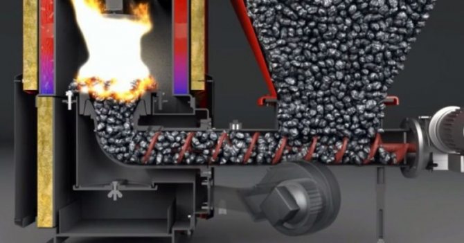 The main feature is a retort burner. It consists of a bowl - a retort, a feed auger with a gearbox and an electric motor, and a fan for air injection. Coal from the hopper will fall into the intake opening of the auger feed, which moves it into the bowl. The latter has lateral slots for the intake of air forced by the fan.