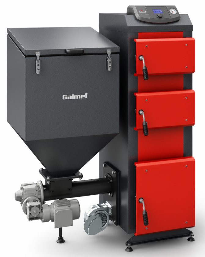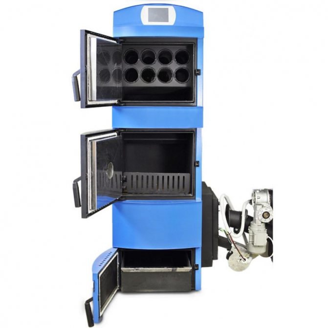 A striking representative of this type of heaters is an automatic coal boiler of the Heiztechnik brand, equipped, in addition to the main units, with a circuit for supplying hot water, a circulation pump and a programmable controller with the ability to connect external thermostats. The controller controls the operation of the burner and can stop it at any time, which is a significant advantage for solid fuel units. Another plus is the ability to put the grate in a short time, remove the burner and continue working with the traditional direct combustion of fuel in the furnace. The efficiency of the unit is declared by the manufacturer at the level of 88%.