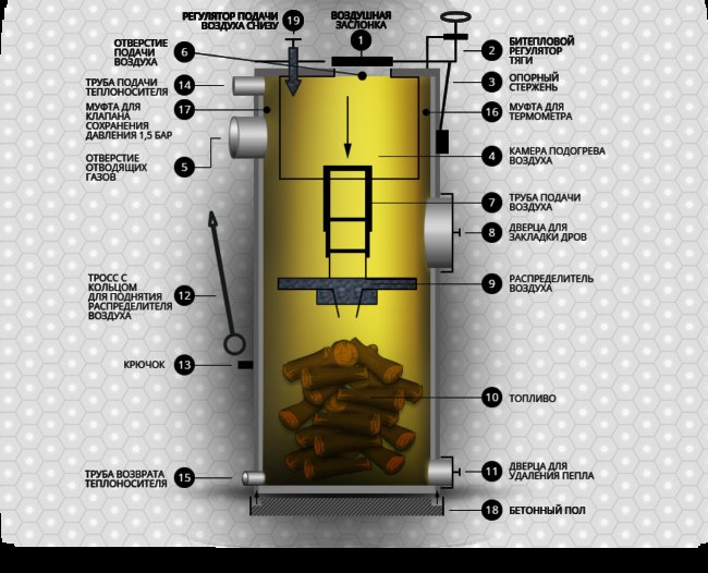 The principle of operation of such devices is quite simple. Fuel is placed in the first combustion chamber. With little air intake, the wood smolders and releases pyrolysis gas. which enters the second chamber. Here the gas is burned and heats the heating medium of the home heating system.