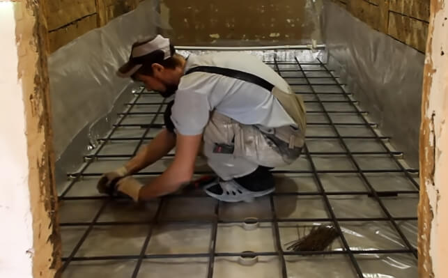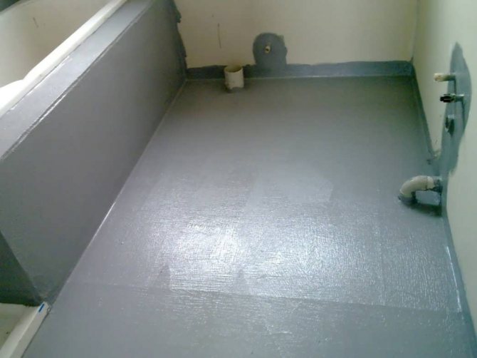 After waiting for complete drying, you need to carefully inspect the surface - so that there are no non-oiled areas. The floor should be flat and uniform. For confidence it is better to apply a second coat. Then a screed is made - a reinforcing mesh is laid. When using rubber compounds as waterproofing, it is necessary to make a screed - the tile adhesive does not adhere well to the rubber-impregnated surface.