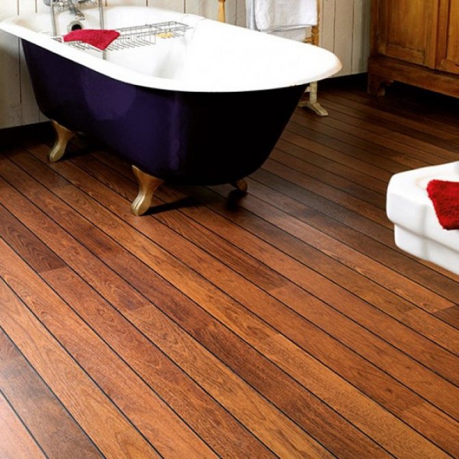 If it is planned to leave the floor wooden, the so-called thermal tree, treated with steam in special vacuum boxes, is chosen. Instead of conventional waterproofing, parquet varnishes, stains, priming varnishes are used. In this case, all cracks, joints must be carefully missed. This method can be used in particularly humid rooms, such as a bath.
