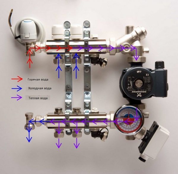 The system consists of a distribution unit, which includes a manifold, pump and mixing unit, and a heating circuit. The optimal area for heating with one circuit is considered to be 10-15 m2, therefore, for large rooms, a system is designed with several circuits and the possibility of separate shutdown of each of them.