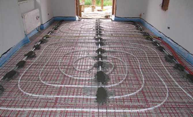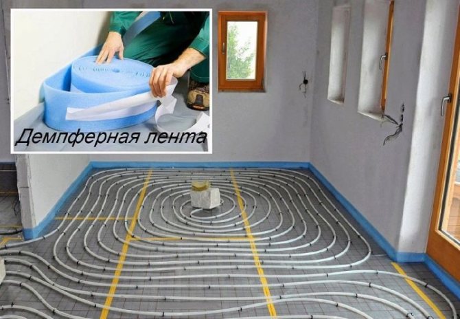 To prevent cracking in large rooms, professionals divide the area to be treated into segments using a damper tape. The supply pipe is connected only in the direction from the collector.