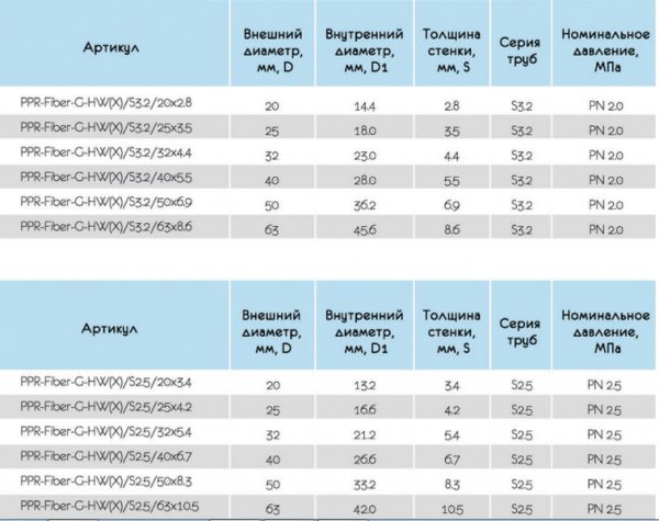 Table of characteristics of polypropylene pipes