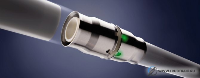 - The edge of the pipe is processed with a calibrator, cleaned. A crimp fitting is put on the pipe (the fact that the fitting has entered deep enough is shown by an indicator - a special window). A nozzle is inserted into the press under the corresponding diameter (the base of the tool rotates, so it is convenient to work with it in any place and position The pipe is placed in the mouth of the press and crimped in a few seconds.