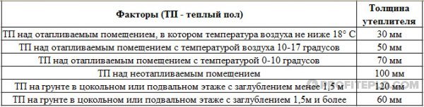 Depending on the specifics of laying (on the ground, on a warm floor, in the southern region, on permafrost, etc.), the thickness of the insulation for a warm water floor can be 3-20 centimeters. Using EPPS, insulation of the smallest thickness can be performed.