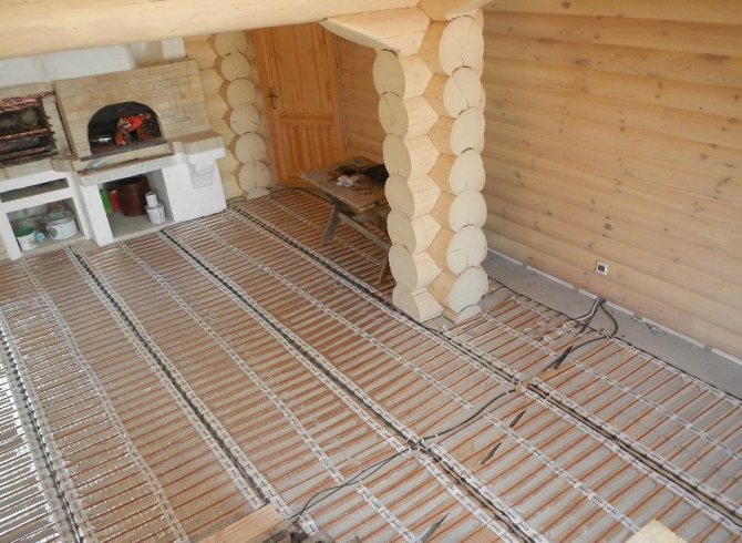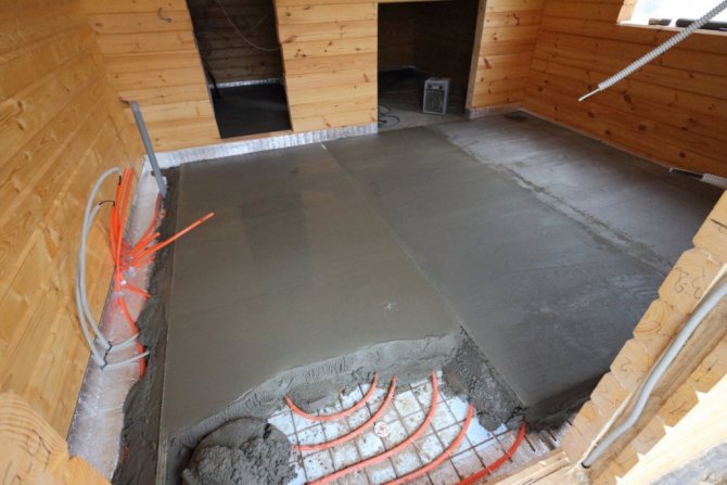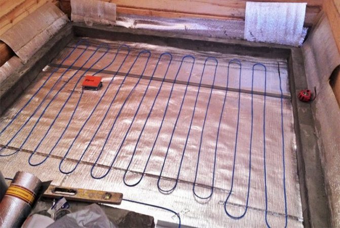 The best option for underfloor heating in a bath is a concrete floor. Wooden floors will also work. The main thing is not to forget to insulate it - there is no point in heating the subfloor.