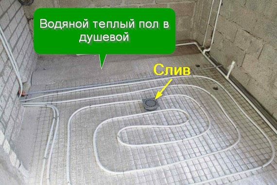 It will not be possible to combine a warm floor and crevice water removal. Underfloor heating can be done only where there is drainage along the slope into the ladder. In the rest room and dressing room, of course, there is no such restriction.