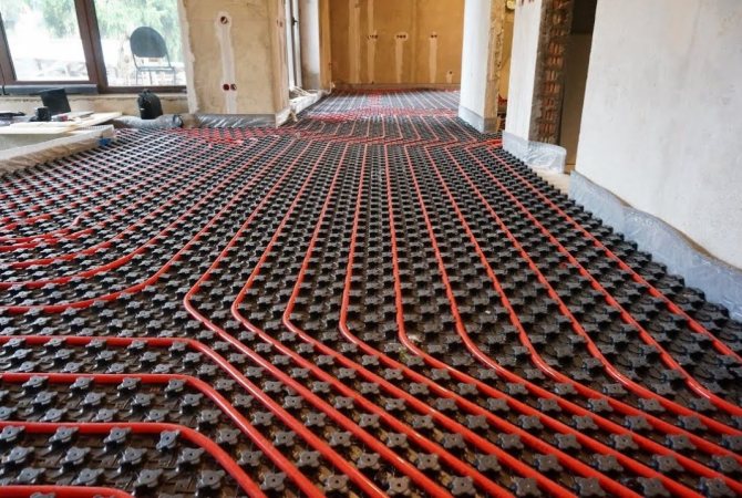 - Polystyrene system. Special polystyrene slabs with pipe recesses are laid on the subfloor. The heating circuit is then assembled.