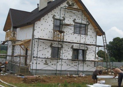 The stage of preparatory work begins with the installation of scaffolding designed to protect the facade of the house from the unwanted effects of atmospheric phenomena. The walls of the building must also be pre-prepared and treated appropriately to remove any dirt, fungi, old coatings or unevenness. Before the thermal insulation is laid, the surface of the walls must be flat with an allowable difference of 1 cm per 1 m in length.