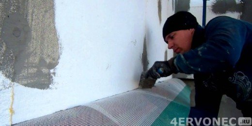 Then they proceed to the installation of the reinforcing mesh on the facade. This is a special fiberglass mesh that is fixed to the insulation either with plastic fasteners or on plaster. When attaching the mesh to the plaster, it is important to ensure that the layer of the composition on the wall is at least 2 millimeters.