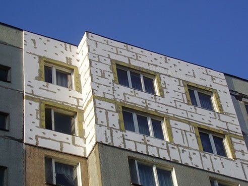 Insulation of house facades with expanded polystyrene - type of building after completion of installation work