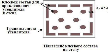 - Apply glue to the slab with a continuous strip 10 cm wide around the perimeter, stepping back from the square by 3 cm, and three slides with a diameter of 20 cm in the center. The thickness of the layer is 2 cm. If the wall is perfectly flat, then the glue can be applied over the entire surface of the insulation board. First, small portions are rubbed with effort in the right places, then the main layer is applied.