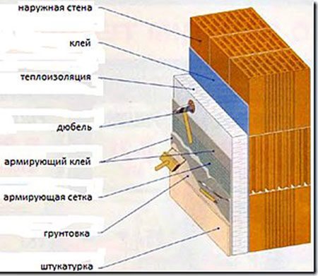 So what is a wet facade? This is a "layer cake" made of insulation and plaster. Between them there are still several fastening, necessary layers, but the main thing in the "wet" finish is thermal insulation, laid on the walls of the house and covered with plaster mortar. From the photo you can study the structure of the wet plastering method more clearly.