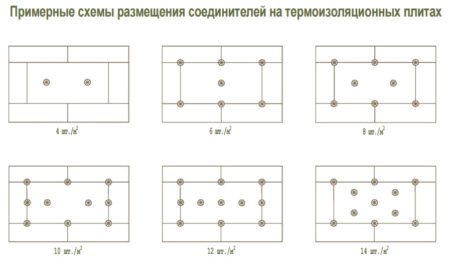 Now press the slab against the wall. Remove excess mortar with a trowel. It is better to fasten the plates with a sling, then there are no gaps for the entry of cold to the walls. On the packaging, read the time for complete drying of the composition, usually at least a day. Let the glue dry. If you start fixing with "fungi" ahead of time, then the insulation may lag behind the wall at the edges. When fastening, use plastic, as they do not provide a cold bridge. Fix according to the scheme shown in the photo.