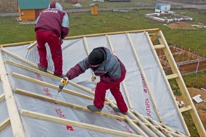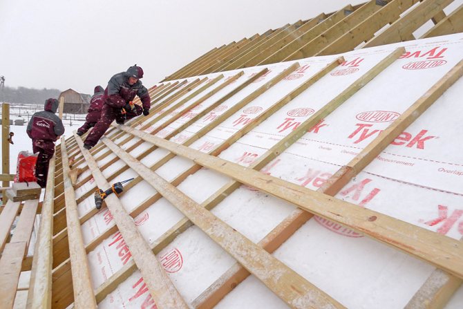 For reliability, the insulation is covered with a special vapor-permeable membrane from the outside. It is important to prevent it from getting wet, because then the material loses all its qualities and it will not be possible to insulate the roof. With the same stapler, carefully fix the membrane along the edges and at regular intervals over the entire area. After that, a wooden crate is mounted, taking into account a gap of 5 centimeters, and sheets of metal tile are already attached to it. At this point, the roof is considered complete. It will be possible to check the insulation for quality only with the onset of cold weather.