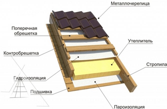 4. Counter-lattice, consisting of wooden battens. Provides the necessary air circulation between metal tiles, battens and insulating materials.
