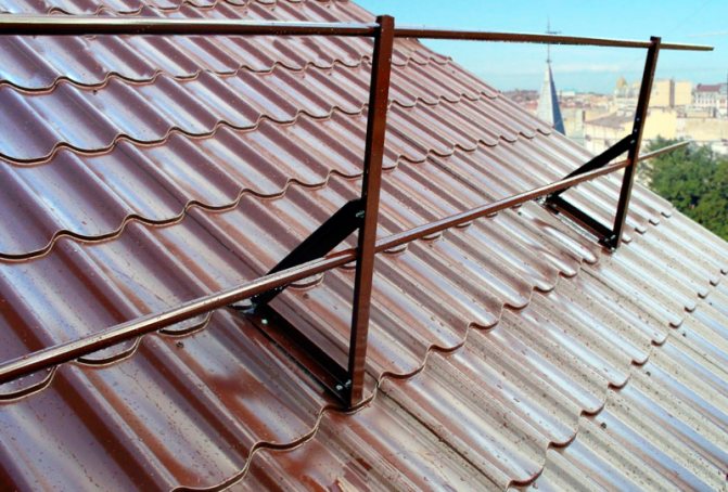 Such metal barriers are essential for roof work. They are attached with special supports to the solid crate through the lower part of the wave and are sealed with rubber gaskets.