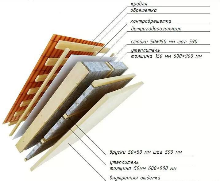 The rafter system is made of bars with a section of 50x150 mm. If the boards have this width, then you can choose a heater with a thickness of 150 mm. If you want to build a roof in cold regions of the country, then you should select bars with a width of about 200 mm. Then you can pick up insulation with a thickness of also 200 mm.