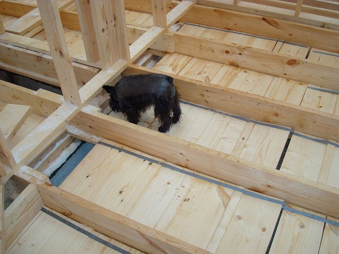 The simplest option, they are laid only with natural (glued will not work!) Boards of coniferous species, the thickness of the boards is at least 25 mm, the distance between the logs is not more than 80 cm, the distance between the beams is 1.0 ÷ 1.3, The thicker the board, the greater the distance maybe between lags. For lags, you can take bars of 50 × 100 mm, the dimensions of the beams are about 100 × 100 mm. There is a desire - make the impregnation with antiseptics, there is no desire - and without impregnation the floors will last for many years. The main difference between pouring floors is that water flows over the entire area in a slot with a width of ≈5 mm.