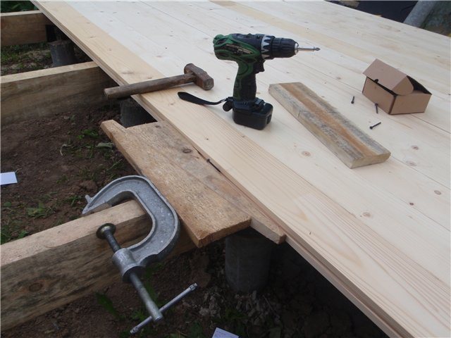 The boards lie across the log, do not forget to leave gaps between them for water to drain. In order for the slots to have the same width, a thin river of suitable thickness can be used as a template. After laying the board, it is removed.