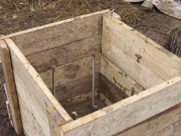 Formwork | In clayey soils, the formwork does not need to be done, the earth will hold its shape anyway, the formwork needs to be done only for the protruding part of the posts. For sandy soils, formwork will have to be made along the entire height of the posts. For formwork, you can use various waste boards, trimming OSB board or plywood. The height of the posts should be below the floor level (in construction, this level is considered to be the zero mark) to the height of the beams, the log and the thickness of the boards. First, you need to set the formwork of the extreme posts, pull the rope between them and put all the rest at this level. |