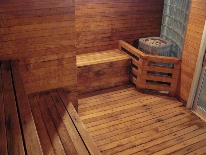 It is a little more difficult to make them, but the comfort of being in the steam room increases. They differ from the flowing ones in that there are no gaps between the boards, but there is a slight slope for draining the water.