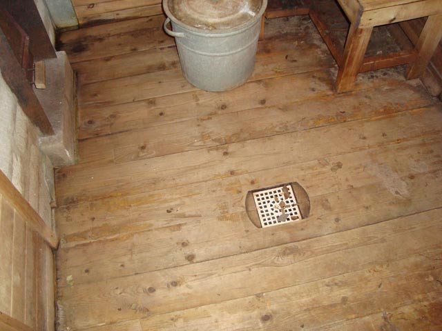 Do not be afraid that the drain floors are cold and in the steam room you will catch a runny nose. The temperature in the steam room is about + 80 ° C, the floor heats up from this heat, and large drafts from small cracks will not appear.