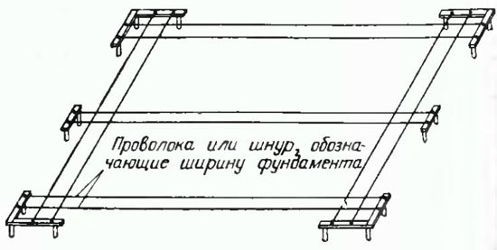 - Further, the markup is done according to the project. The twine stretched between the rods plays the role of a landmark, which indicates the place of digging a trench. It exactly follows the contours of the foundation.