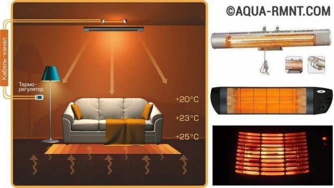 - Wall mounted carbon heaters. They are wall-mounted and are quite common. These heaters do not heat the room as efficiently as ceiling heaters due to the direction of heat movement, but they are very convenient, since they practically do not take up space.From the large selection that we are offered, you can buy models with an original design, which will only add attractiveness to your interior.