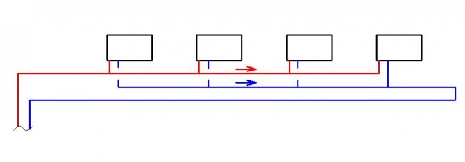 So, the associated heating system is a two-pipe heating circuit, in which the coolant moves in the same direction both in the "supply" pipeline and in the "return".