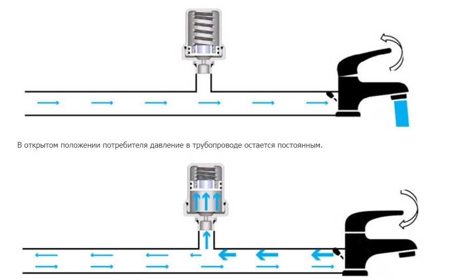 As long as the pressure in the system does not exceed the pressure in this part of the reservoir, nothing happens. When a water hammer occurs, the membrane stretches under the influence of the increased pressure, part of the liquid enters the reservoir. As it normalizes, the elastic membrane tends to return to its normal state, pushing fluid back into the system. Thus, the jump is smoothed out.