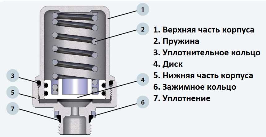 1. Upper body - CW617N brass; 2. Spring - AISI 302; 3. O-ring - EPDM; 4. Disc - plastic; 5. The lower part of the body - brass CW617N; 6. Clamping ring - brass CW614N; 7. Sealing - EPDM.