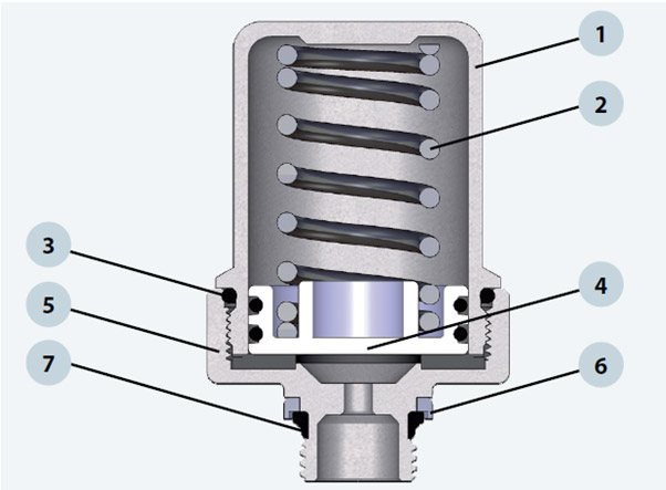 The overpressure is relieved by an air chamber and a steel spring connected to a double sealed plastic disc, which absorb most of the overpressure.