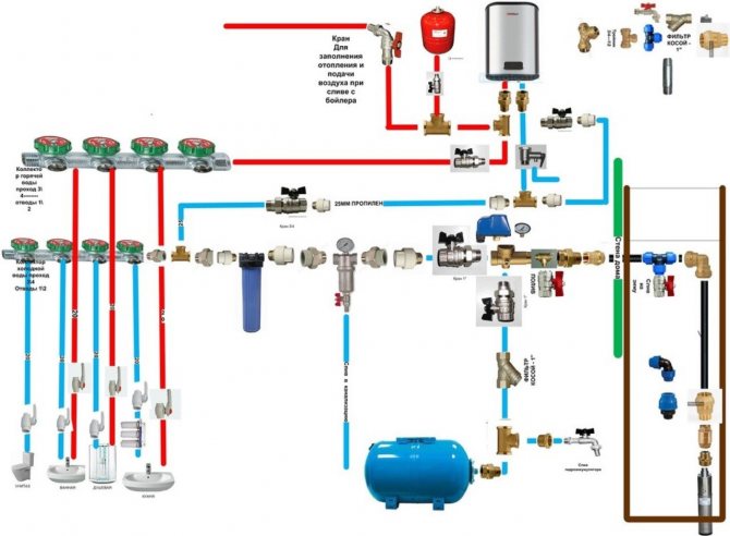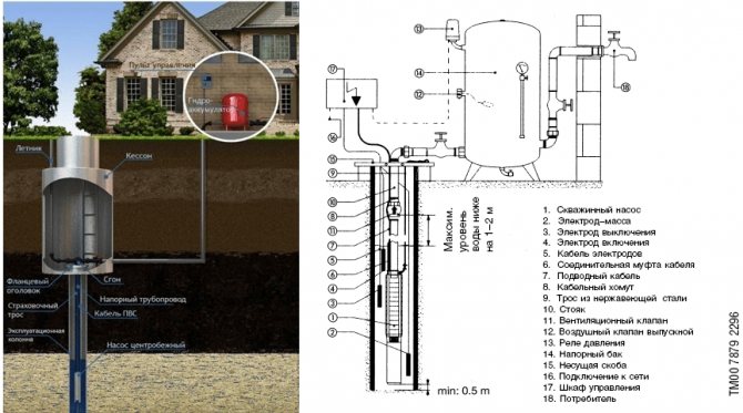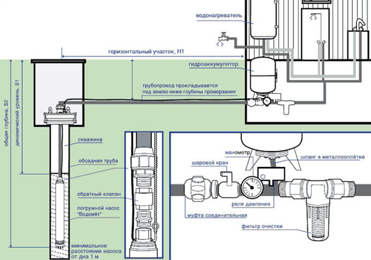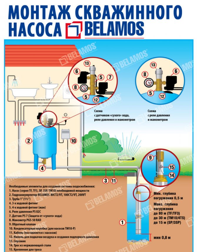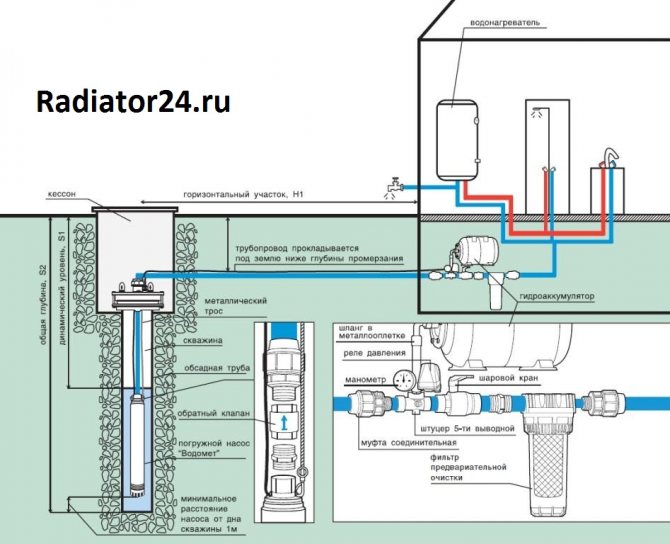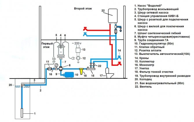 The instruction indicates that surface pumps can be installed in a well if its depth is up to 20 meters. In this case, water comes directly from the well to the parsing points. The scheme for connecting a surface pump to a well includes the following equipment: