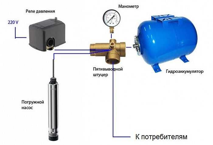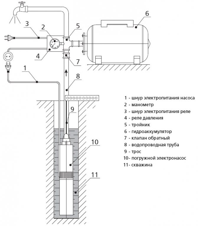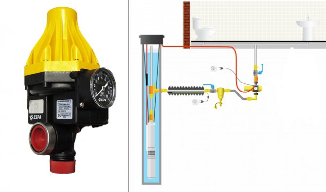 To reduce the cost of a set of pressure equipment, you can use a downhole pump connection diagram only with a pressure switch without a control unit. The device turns off the pump when the pressure reaches its maximum, and starts it when the indicators decrease to a minimum.