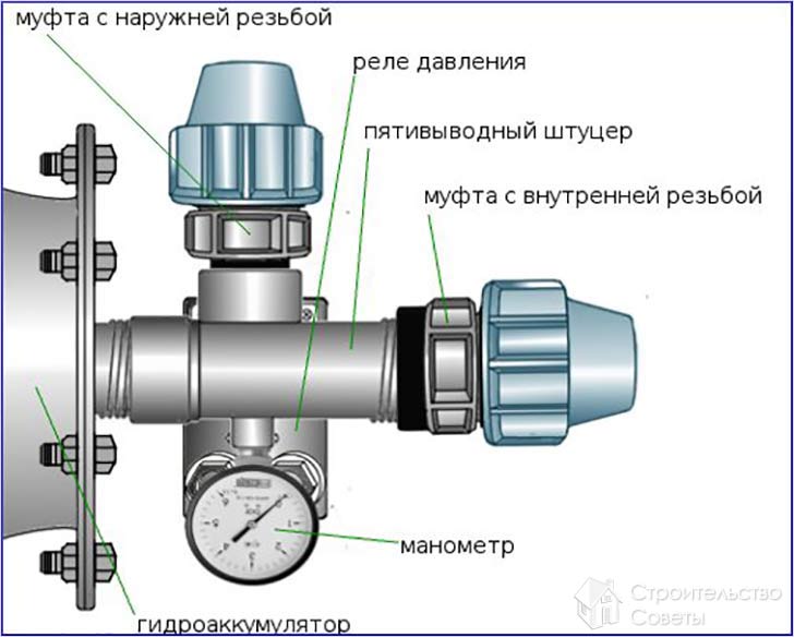 The regulation of the pressure limits in the accumulator is carried out by means of a relay. In the device, using a pressure gauge, the minimum and maximum response parameters are set.