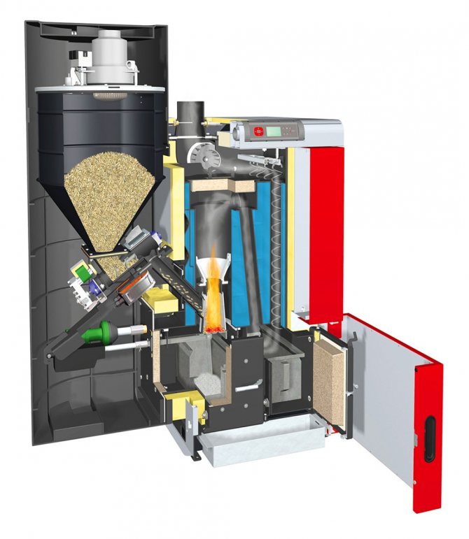 Ils sont également souvent appelés chaudières automatiques. Selon le principe de fonctionnement, ils diffèrent peu des traditionnels, mais en plus de la chambre de combustion, ils ont bunker pour stocker un stock de carburant. Cela signifie qu'il sera inutile de souvent monter et de verser manuellement du combustible dans le four - tout sera fait par un équipement automatique. Environ 7 jours... De plus, un tel système peut être ajusté très précisément pour vous-même. Le carburant est actuellement considéré comme l'un des plus écologiques. Les granulés sont des granulés produits à partir de déchets de bois (sciure de bois, copeaux, etc.). L'efficacité de ces systèmes est de 91 à 95%, le seul inconvénient est le prix élevé des chaudières.